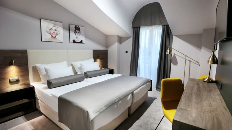De modernt inredda och rymliga dubbelrummen för 2 personer har bra förvaring, utmärkt arbetsyta och breda 180 cm sängar. Rum med balkong och delvis havsutsikt mot tillägg.