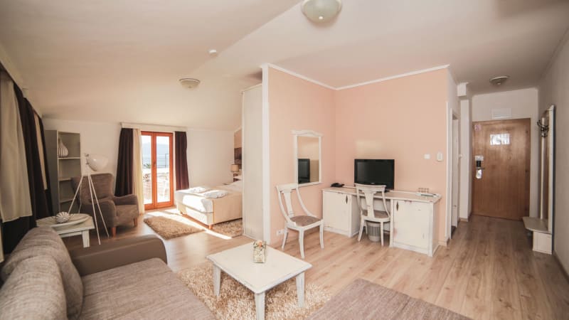 Njut av en bekväm och trivsam vistelse i en välplanerad juniorsvit med härlig balkong och delvis havsutsikt. Rummet är utrustat med en dubbelsäng (100 x 200 cm) samt en bäddbar soffa som fungerar som extrabädd för en tredje person. En perfekt svit för dig som vill bo lite rymligare och njuta av både komfort och en skymt av havet från balkongen.