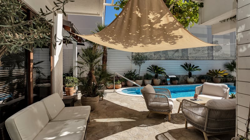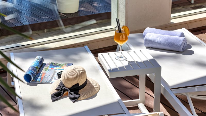Vid stranden, poolen och på takterrassen finns solstolar som hotellets gäster kan nyttja utan kostnad.