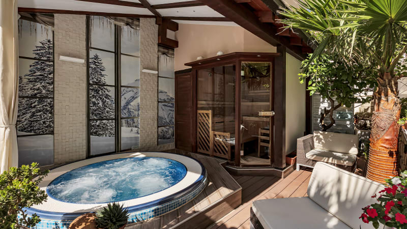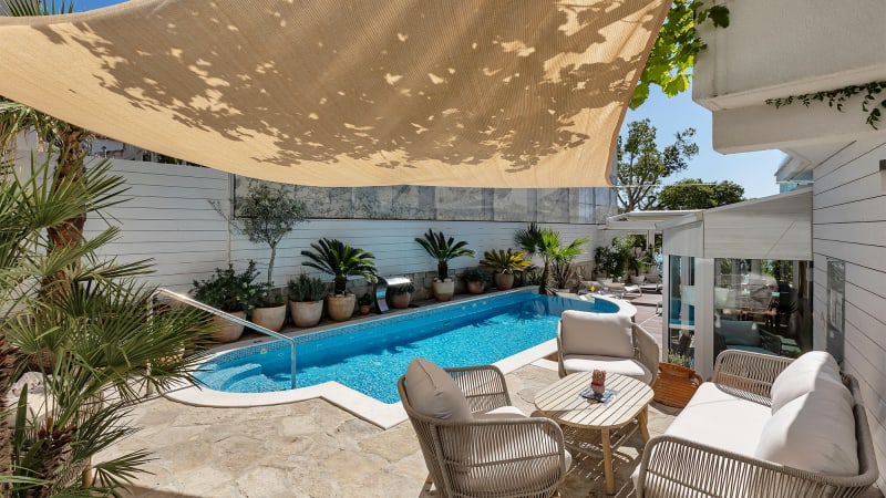 Klapperstensstrand samt uppvärmd (26 °C) utomhuspool (8x3,5 m) med massagemunstycken. I anslutning till poolen finns även jacuzzi och bastu.