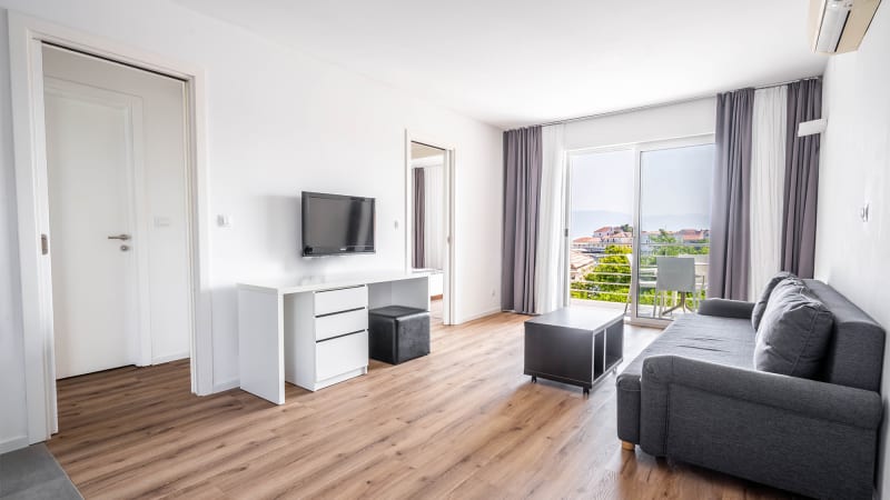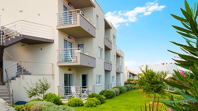 Smakfullt inredda tvårumslägenheter med balkong mot havssidan. Lägenheterna består av ett separat sovrum med dubbelsäng (eller två enkelsängar på förfrågan) samt ett kombinerat vardagsrum och kök med matplats och bäddsoffa/extrasäng (160x200 cm) för 1 vuxen eller 1–2 barn upp till 15 år. Det rymliga badrummet är stilrent med badkar, wc och hårfön.