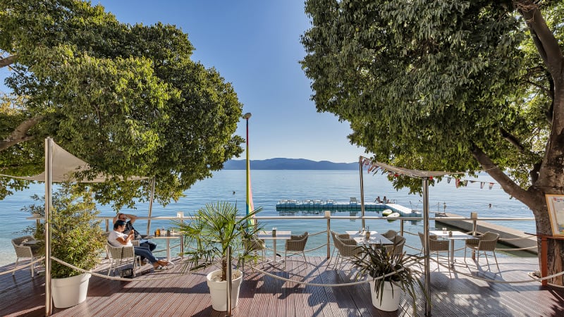 Nedanför hotellet ligger Gradacs strand med en egen del för hotellets gäster, utrustad med solstolar och en flytbrygga i det klara vattnet. I Gradac finns flera fina stränder som sträcker sig långt utanför orten. Längs stränderna löper långa promenadstråk längs kusten med utsikt över halvön Peljesac och ön Hvar.