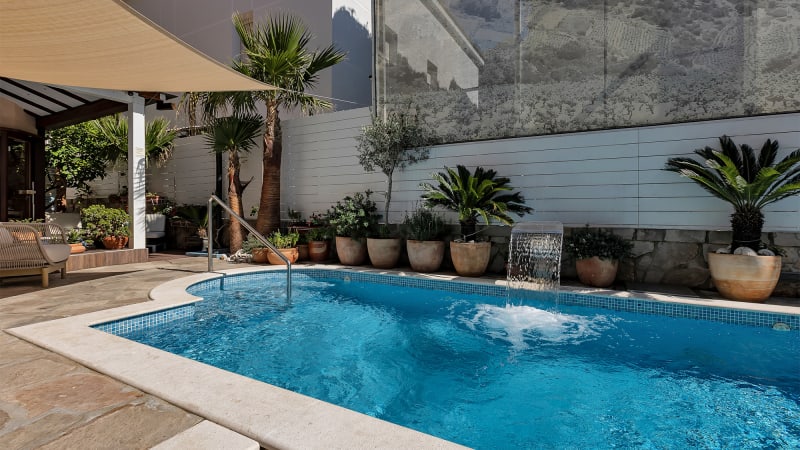 Klapperstensstrand samt uppvärmd (26 °C) utomhuspool (8x3,5 m) med massagemunstycken. I anslutning till poolen finns även jacuzzi och bastu.